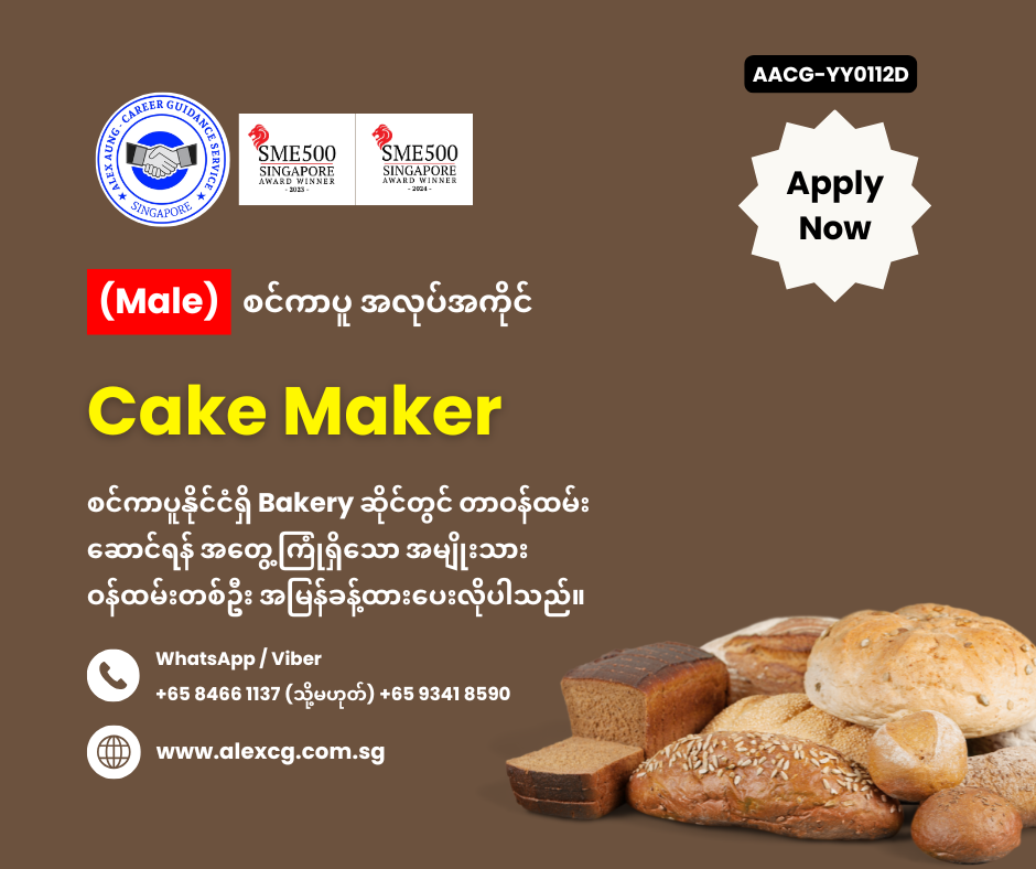 - စင်ကာပူတွင် ကိတ်မုန့်နှင့်မုန့်ပြုလုပ်ခြင်း လုပ်ငန်းအတွေ့ကြုံအနည်းဆုံး ၂ နှစ်ရှိရပါမည်။