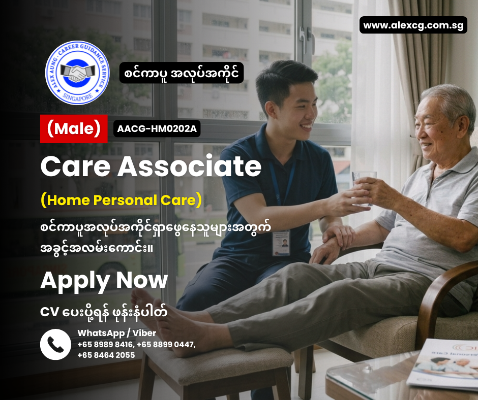- စင်ကာပူတွင် Care Associate လုပ်ဖူးသည့် လုပ်ငန်းအတွေ့အကြုံရှိသူ။ (eg. Under Active Global, Red Crown, THK)