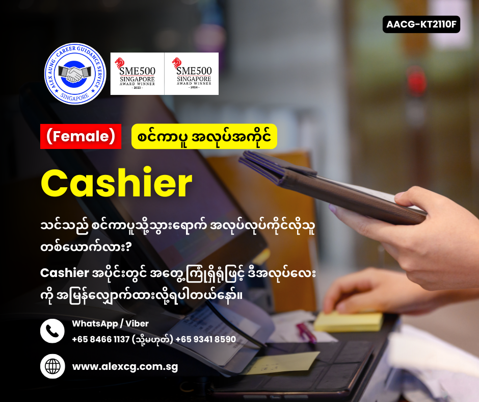 - စင်ကာပူတွင် Cashier လုပ်ဖူးသည့် သူများအား ဦးစားပေးပါမည်။