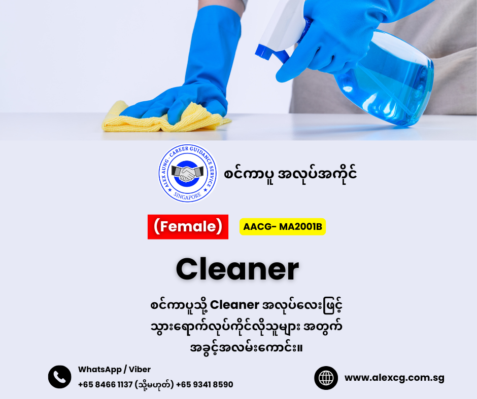 - စင်ကာပူတွင် Cleaner လုပ်ဖူးသည့် လုပ်ငန်းအတွေ့အကြုံ (၂) နှစ်ရှိသူ။