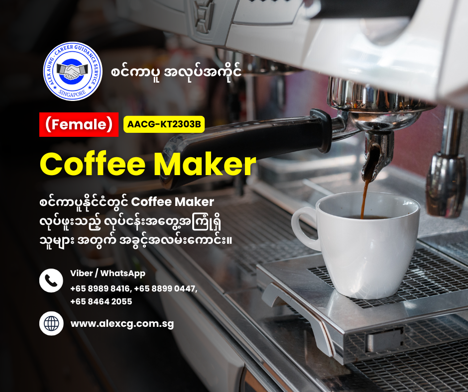 - စင်ကာပူတွင် Coffee Maker လုပ်ဖူးသည့် လုပ်ငန်းအတွေ့အကြုံရှိရပါမည်။