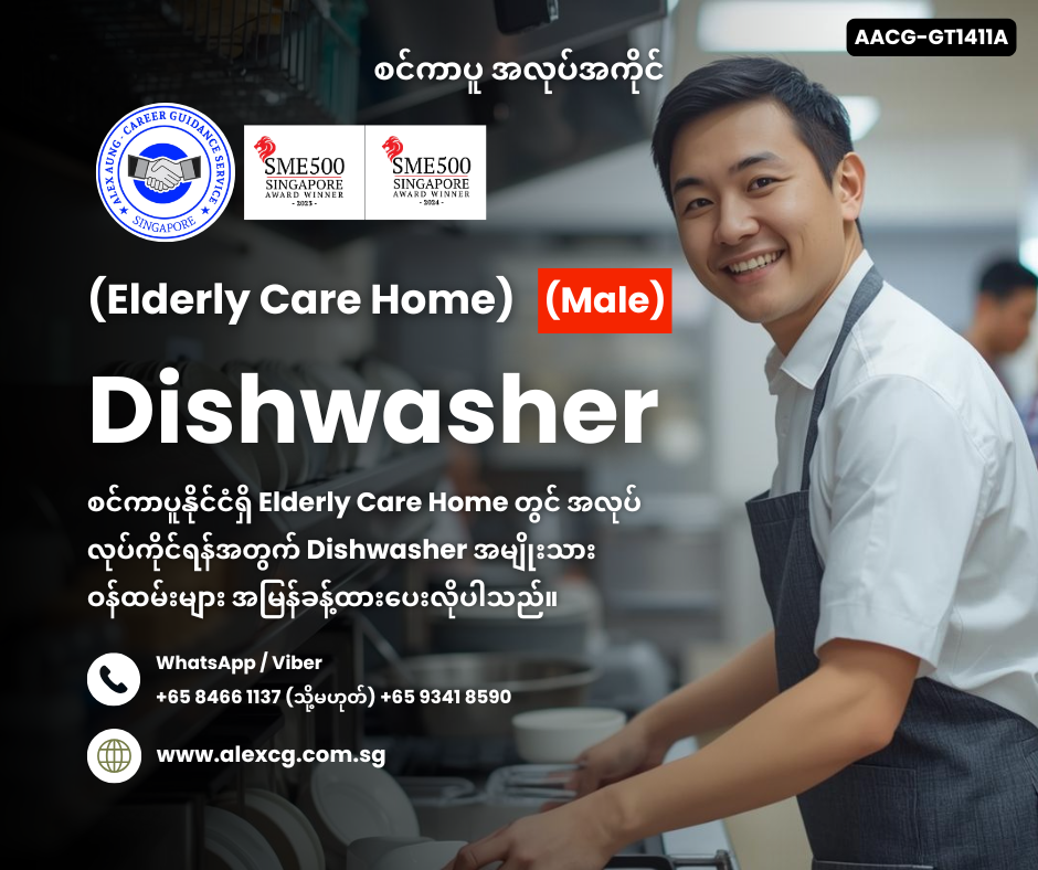 - စင်ကာပူနိုင်ငံရှိ Elderly Care Home တွင် အလုပ်လုပ်ကိုင်ရပါမည်။
