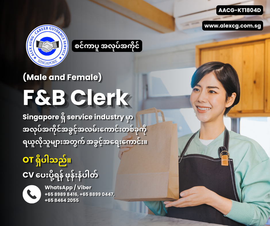 WhatsApp / Viber +65 8989 8416,+65 8899 0447, +65 8464 2055 မှာ အလုပ်လျှောက်ပါ။