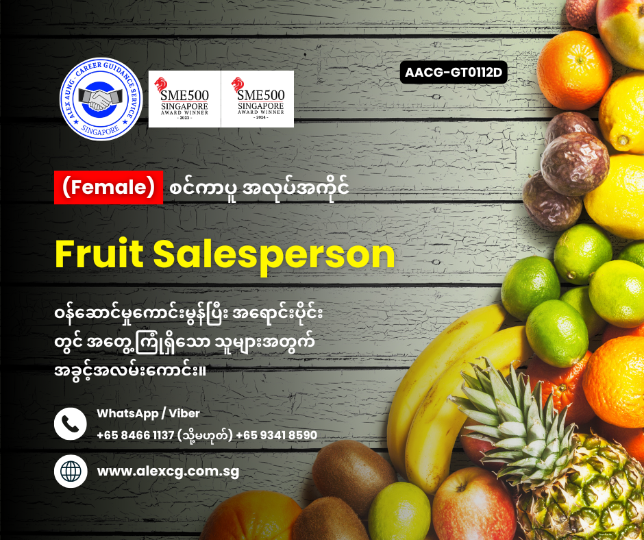- စင်ကာပူနိုင်ငံစျေးဝယ်စင်တာရှိ သစ်သီးဆိုင်တွင်အလုပ်လုပ်ကိုင်ရပါမည်။