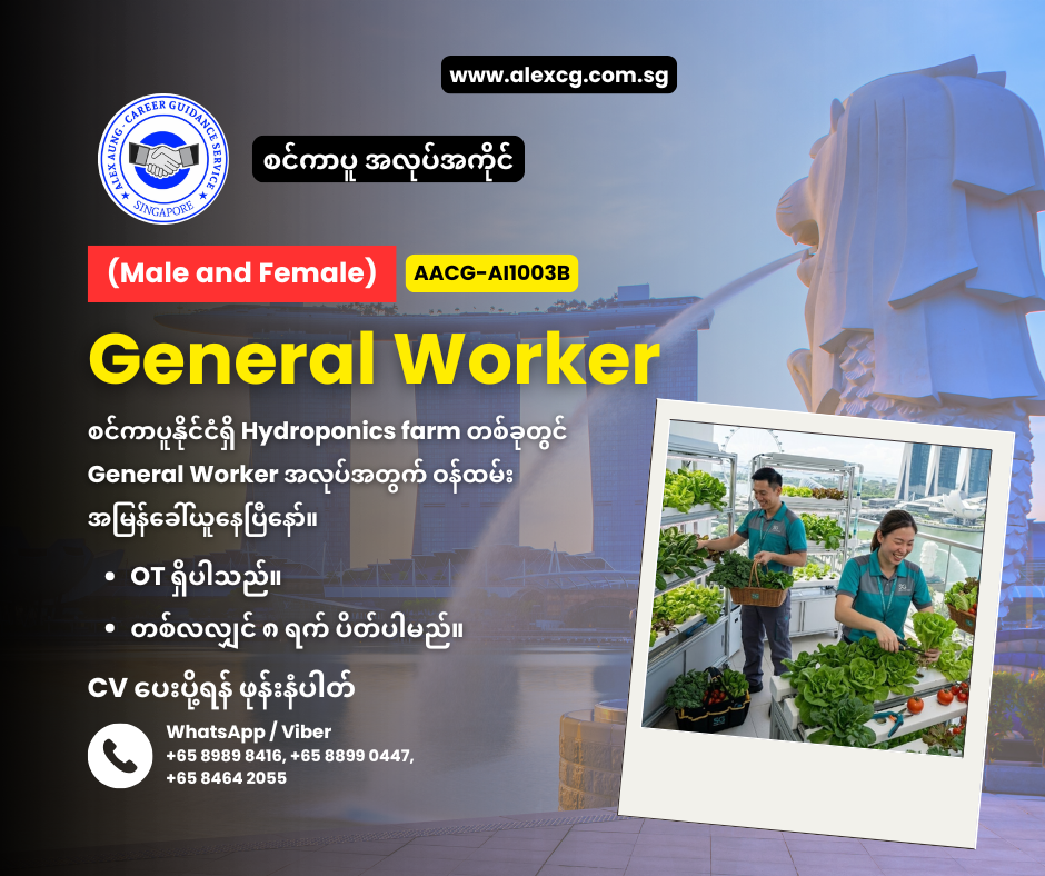 WhatsApp / Viber +65 8899 0447, +65 8989 8416, +65 8464 2055 မှာ အလုပ်လျှောက်ပါ။