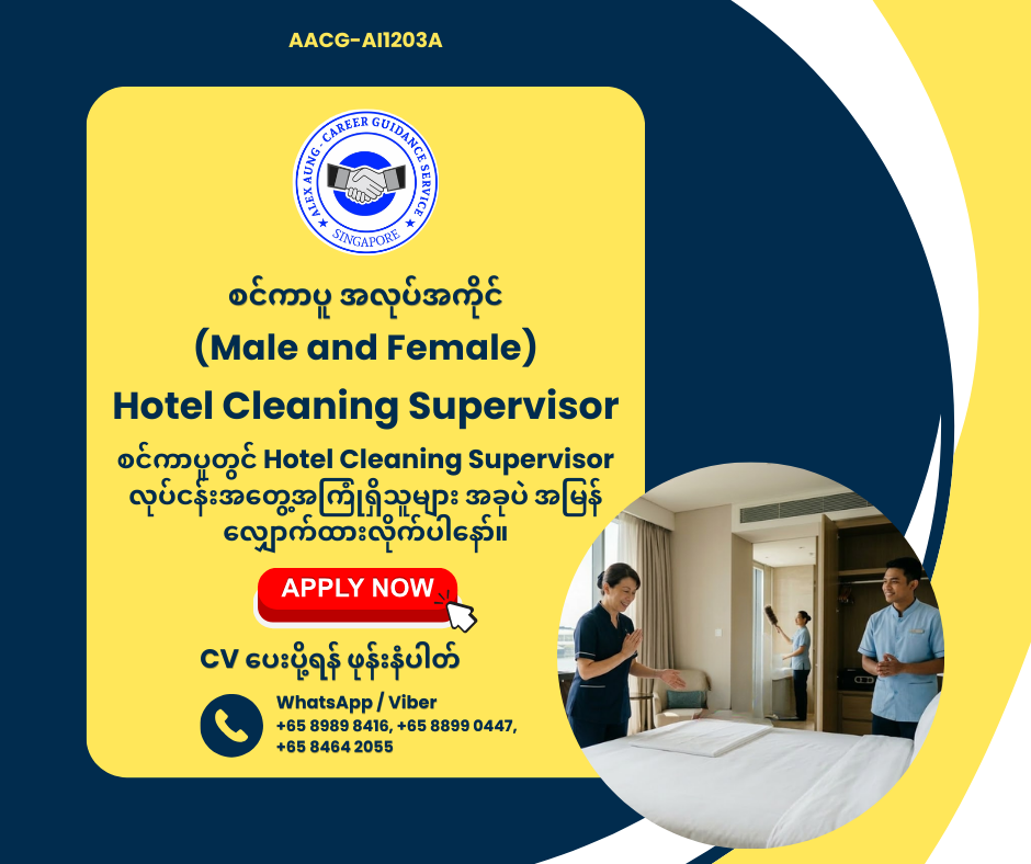 - Singapore တွင် Room Supervisor အဖြစ် အတွေ့အကြုံ ၁ နှစ် အနည်းဆုံးရှိရမည်။