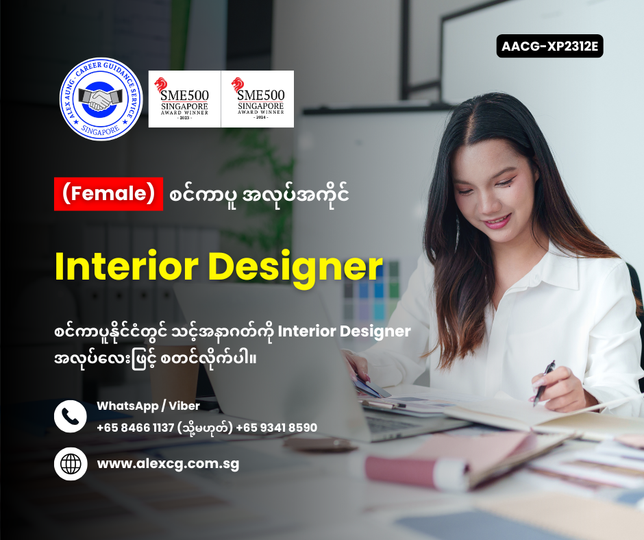 - Interior Design အလုပ်အတွေ့အကြုံ အနည်းဆုံး ၂–၃ နှစ်ရှိသူ။