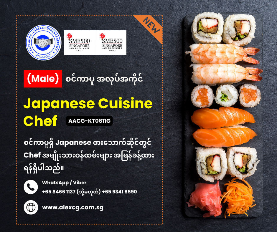 - Japanese Cuisine Chef လုပ်ဖူးသည့် အတွေ့ကြုံ အနည်းဆုံး ၃နစ်ထက်ရှိရပါမည်။