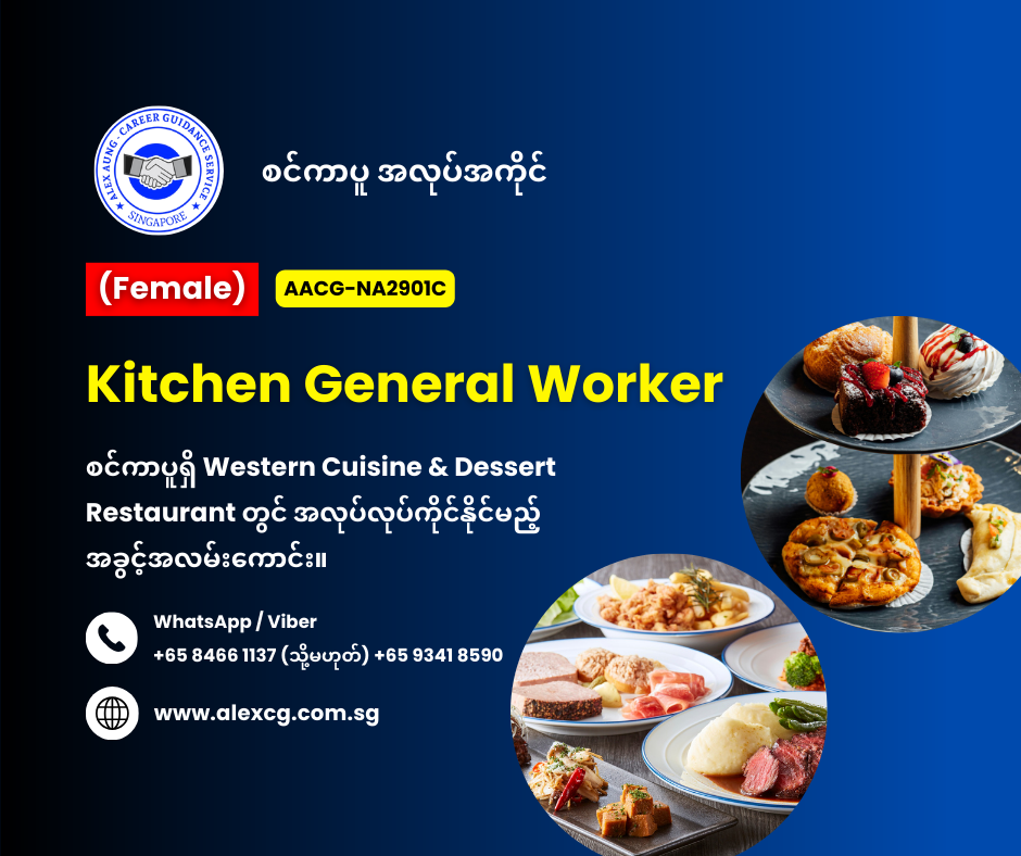 - စင်ကာပူနိုင်ငံရှိ Western Cuisine & Dessert Restaurant တွင်အလုပ်လုပ်ကိုင်ရပါမည်။