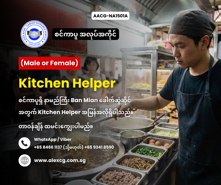 • Kitchen Helper အတွေ့အကြုံ ရှိရမည်။