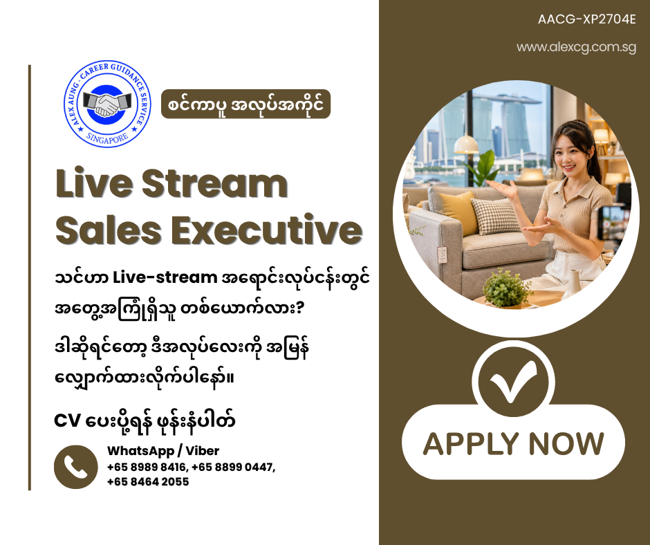 WhatsApp / Viber +65 8989 8416, +65 8899 0447, +65 8464 2055 မှာ အလုပ်လျှောက်ပါ။