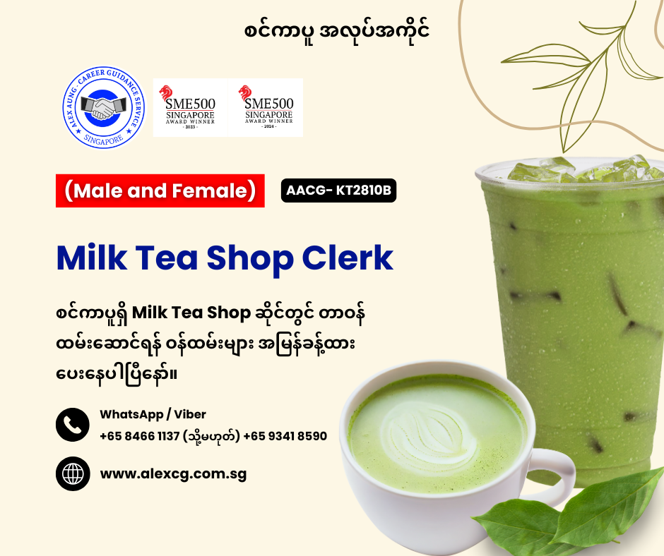• Milk Tea Shop ဆိုင်များတွင် လုပ်ဖူးသည့် လုပ်ငန်းအတွေ့အကြုံရှိသူ။