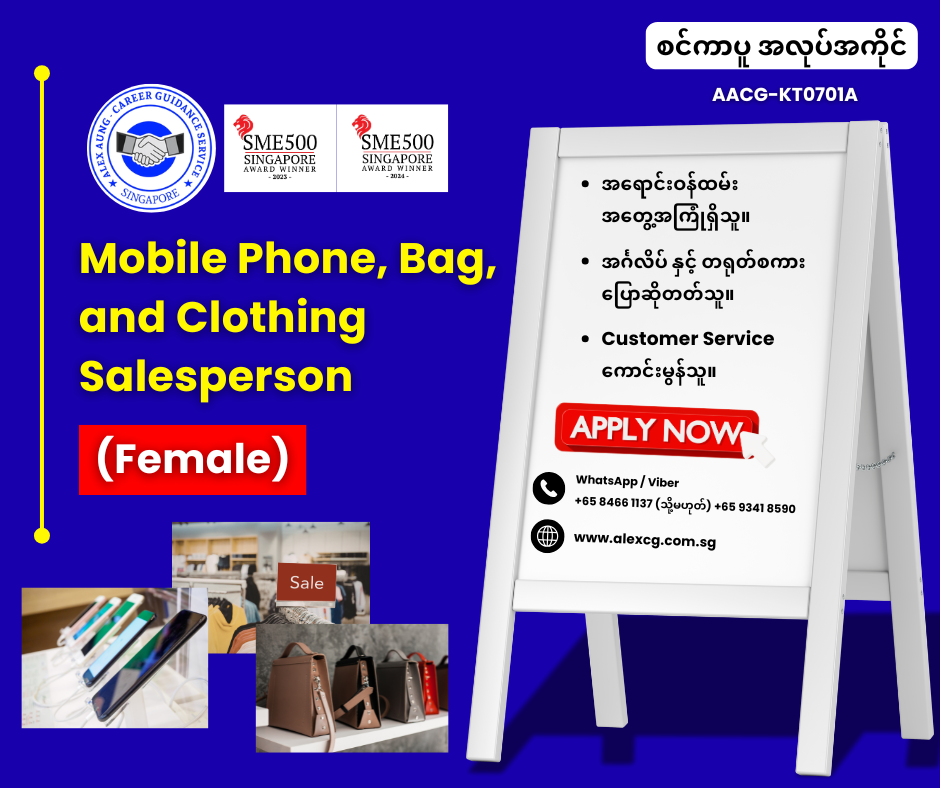 WhatsApp/Viber +65 8466 1137 / +65 9341 8590 မှာ အလုပ်လျှောက်ပါ။