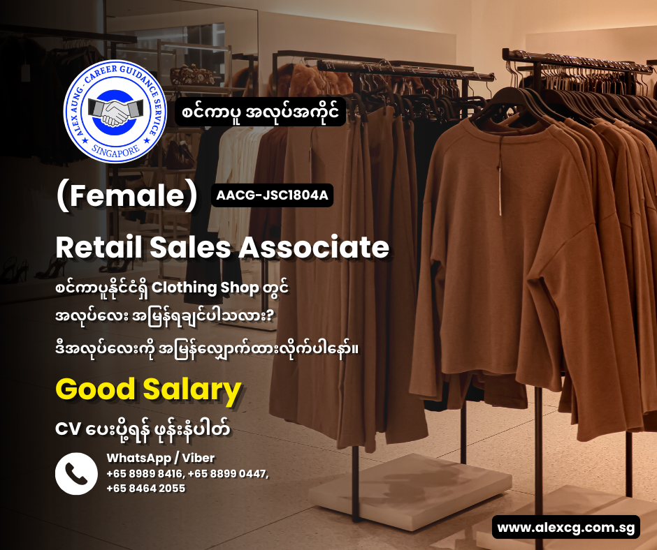 WhatsApp / Viber +65 8989 8416,+65 8899 0447, +65 8464 2055 မှာ အလုပ်လျှောက်ပါ။