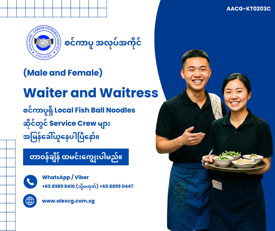 • Waiter and Waitress လုပ်ဖူးသည့် လုပ်ငန်းအတွေ့အကြုံရှိသူ။