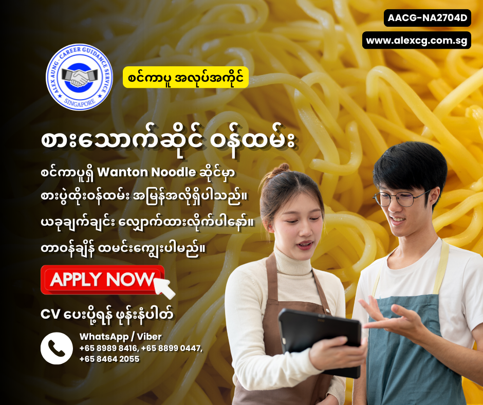 WhatsApp / Viber +65 8989 8416, +65 8899 0447, +65 8464 2055 မှာ အလုပ်လျှောက်ပါ။