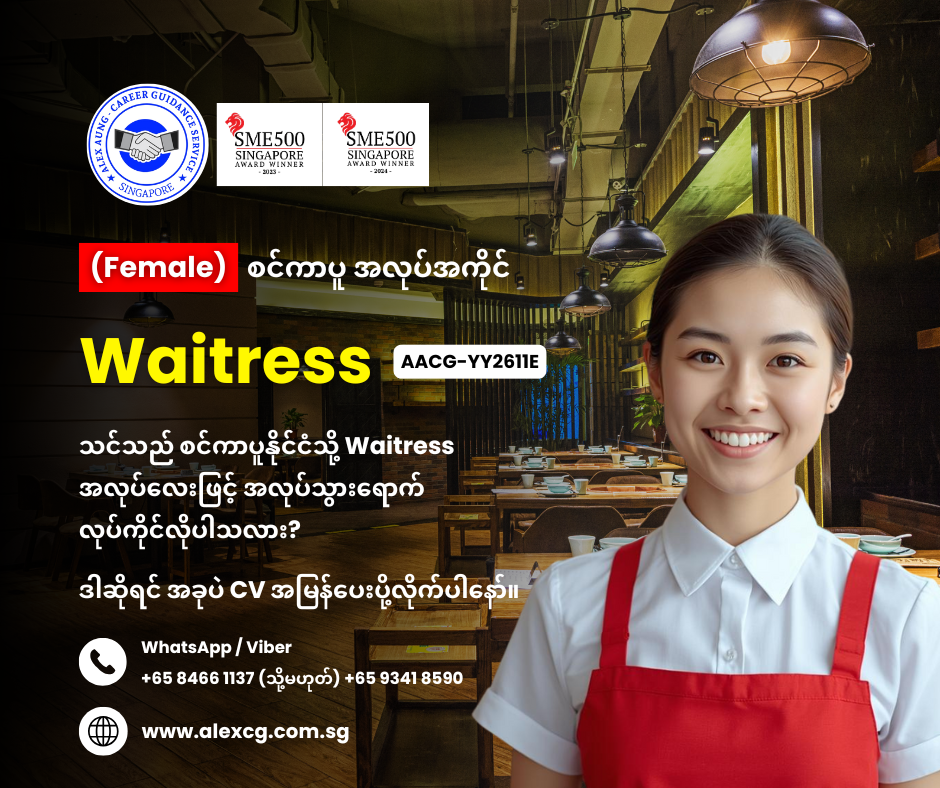- Waitress လုပ်ဖူးသည့် လုပ်ငန်းအတွေ့အကြုံရှိသူ။
