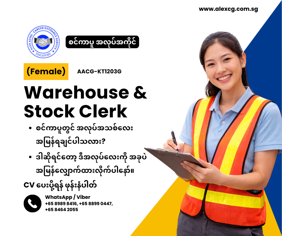 • Warehouse & Stock Clerk လုပ်ဖူးသည့် လုပ်ငန်းအတွေ့အကြုံရှိသူ။